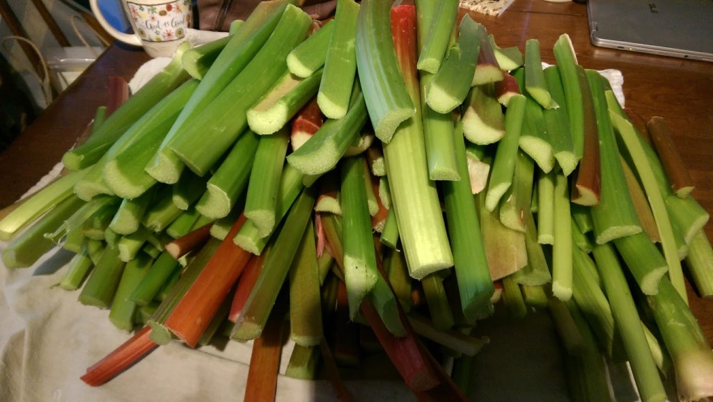 The question of the day is, “Can you have too much Rhubarb?” I would say no. I have four rhubarb patches. Patches not plants as I use a lot of rhubarb. The other day I chopped 87 cups of rhubarb for jams, pies and crisps from one picking.